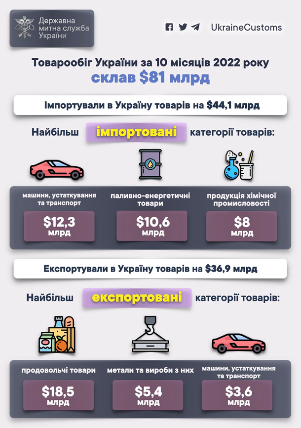 С Украины в январе-октябре 2022 года экспортировано продукции на 36,9 млрд долларов, импортировано — 44,1 млрд долларов. Всего товарооборот Украины за 10 месяцев составил 81 млрд долларов. Однако по сравнению с прошлогодними показателями за тот же период экспорт товаров за десять месяцев упал на 32,3%, импорт — на 23,9%. Об этом сообщает Государственная таможенная служба Украины.