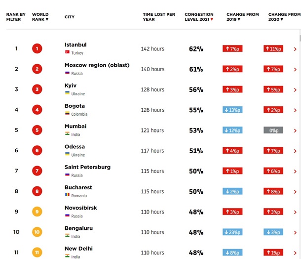 Так, среди 404 городов мира по интенсивности автомобильных пробок на дорогах Днепр занял 25 место, Харьков — 12 место, Одесса оказалась на шестом месте, а Киев — на третьем.