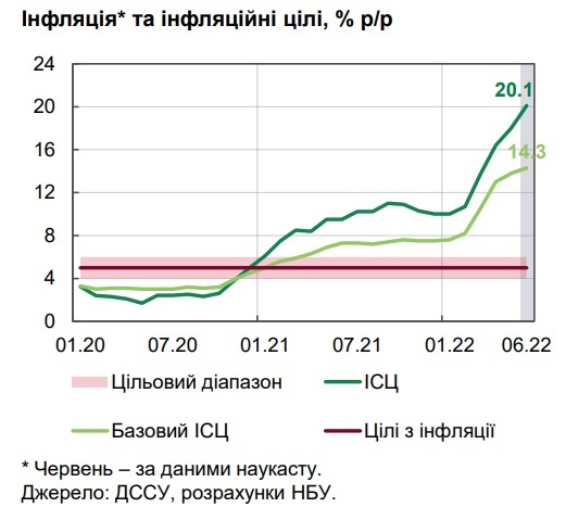 Потребительская инфляция в Украине в июне ускорилась до 20,1% г/г в июне (с 18,0% в мае). Об этом говорится в ежемесячном макроэкономическом и монетарном обзоре НБУ, обнародованном в пятницу, 8 июля.