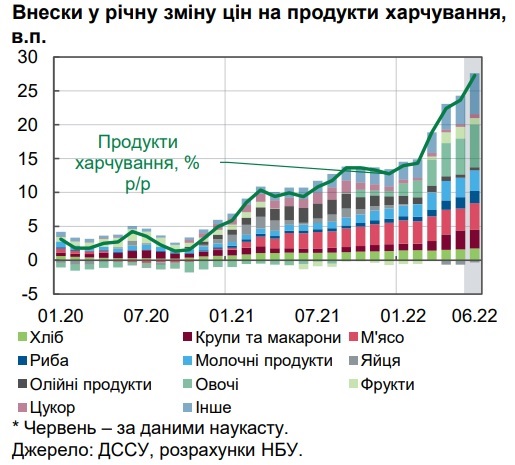 По данным НБУ, в дальнейшем ускорялся рост цен на сырые продукты, что, прежде всего, связано с появлением ранних овощей, которые в этом году значительно дороже вследствие временной оккупации южных регионов, специализирующихся на их выращивании, а также роста расходов на их производство и поставку.