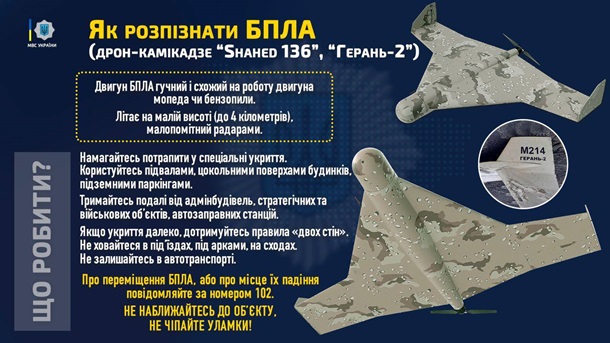 Министерство внутренних дел 14 декабря опубликовало памятку, как распознать дроны-камикадзе Shahed-136, которые РФ использует для ударов по Украине под маркировкой Герань-2.