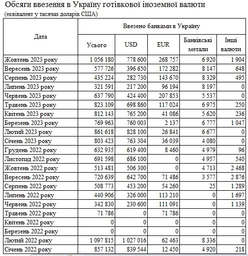 Объем наличной иностранной валюты, ввезенной банками в Украину в октябре 2023 года, составил 1,056 млрд. дол. — это больше всего с февраля 2022 года, о чем свидетельствуют данные НБУ.