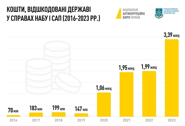 В течение 2016-2023 годов по делам САП и НАБУ государству возмещено более 9 млрд грн. Об этом информирует пресс-служба САП в четверг, 8 августа.