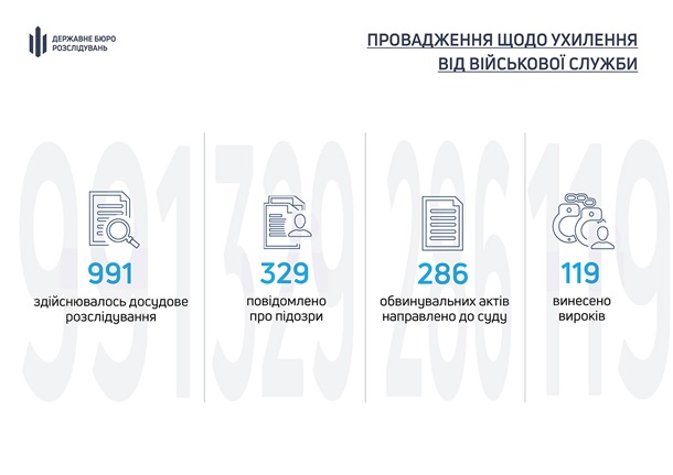 Так, с февраля 2022 года сотрудники ГБР осуществляли досудебное расследование в 991 уголовном производстве по факту уклонения от военной службы по ст. 409 Уголовного кодекса Украины.