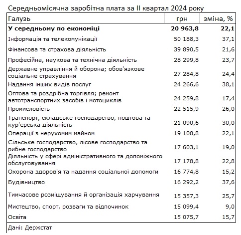 По данным Госстата, самая высокая заработная плата в сфере Информация и телекоммуникации, где она выросла на 37,1% до 50 188 гривен.