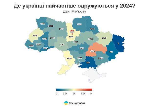 При исключении оккупированных территорий и регионов, где ведутся боевые действия, меньше всего разводов в Закарпатской области — 224, а меньше всего женятся в Черновицкой области — 1376 новых семей в этом году.