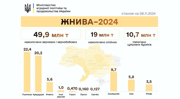По состоянию на 8 ноября 2024 года в Украине уже намолочено 68,9 млн тонн нового урожая зерновых и масличных культур. Об этом сообщили в Министерстве аграрной политики и продовольствия.