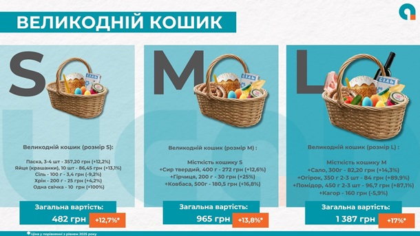 Что касается стоимости пасхальной корзины в этом году, то бюджетный вариант, который включает паску, десяток крашенок, соль, хрен и свечу, стоит в среднем 482 грн — на 12,7% дороже, чем в 2025 году. Если добавить твердый сыр, колбасу и горчицу, корзина будет стоить 965 грн (+13,8% к прошлому году). А максимальное наполнение с кагором, свежими огурцами, томатами и салом увеличит расходы до 1 387 грн, что на 17% дороже, чем в прошлом году.