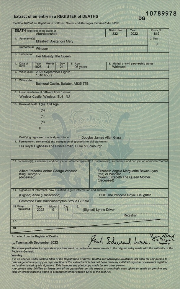 Свидетельство о смерти опубликованном Национальным архивом Шотландии, сказано, что причиной смерти королевы Елизаветы II стала старость. Об этом сообщает The Telegraph. В свидетельстве, подписанном ее дочерью принцессой Анной, которая была с ней в последние 24 часа жизни, также говорится, что Елизавета Александра Мэри Виндзор в 15:10 8 сентября в возрасте 96 лет в замке Балморал.