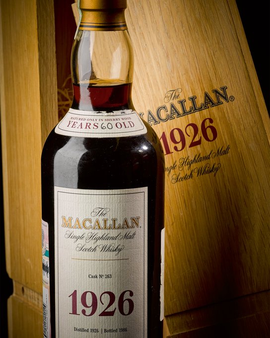 На аукционе, прошедшем 24 октября в Лондоне, продали бутылку шотландского виски Maccallan 1926 года 60-летней выдержки. Имя покупателя лота неизвестно.