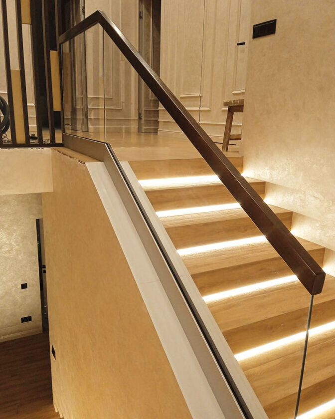 Второй важный компонент — закаленное стекло. Оно в несколько раз прочнее обычного и способно выдерживать сильные удары. В случае повреждения оно распадается на мелкую крошку с тупыми краями, о которые практически невозможно пораниться. Такое сочетание технологий делает стеклянные перила не только стильным, но и одним из самых безопасных решений для дома.