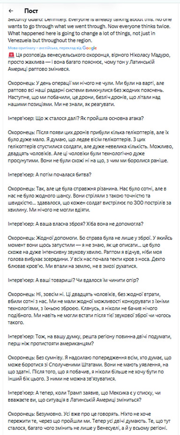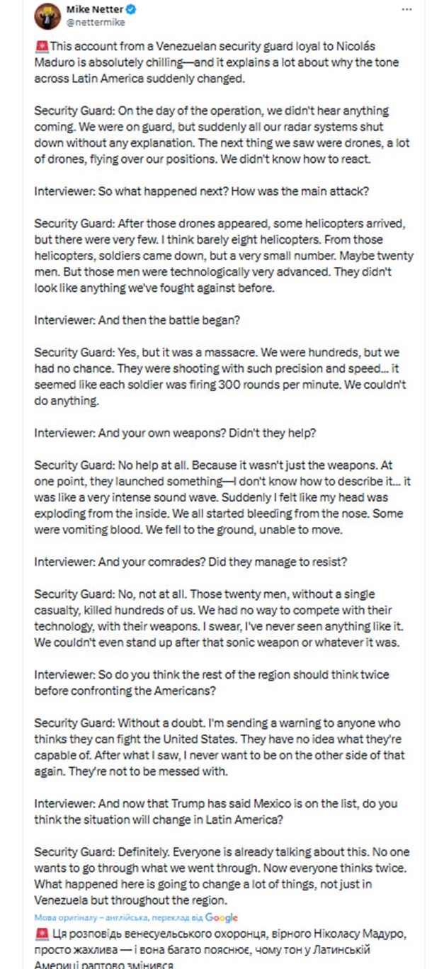 Очевидец также отметил, что 20 американских военных как будто остались без жертв, несмотря на то, что уничтожили сотни венесуэльских солдат. Он подчеркнул, что местные силы не имели шансов противостоять такой передовой технологии.
