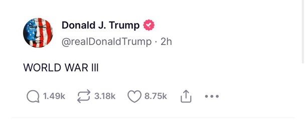 Так, Трамп сделал загадочный пост, написав лишь «Третья мировая война». Объяснения или каких-либо других комментариев к своему посту он не добавил.