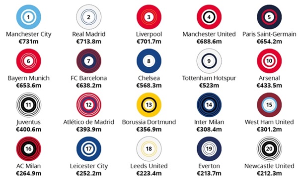 На вершине в прошлом году был Манчестер Сити (731 миллион евро), который опережает Реал и Ливерпуль. Кроме чемпионов Испании в лучшей 20-ке из не английских клубов также находятся ПСЖ, Бавария, Барселона, Ювентус, Атлетико, Боруссия, Интер и Милан.