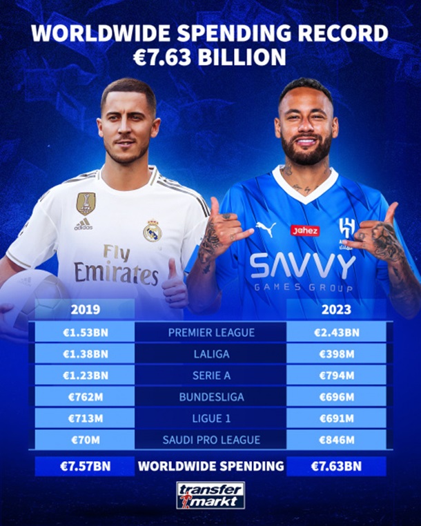 Высшая лига Саудовской Аравии зарекомендовала себя как тяжеловес на трансферном рынке, поскольку финансовый фейр-плей не играет роли на Ближнем Востоке. С нынешними 846 млн евро трансферных расходов, субсидируемая государством лига позиционирует себя как новый авторитет благодаря ряду богатых клубов и частично ответственна за то, что выводит мировые расходы в новые измерения», — пишет Transfermarkt.